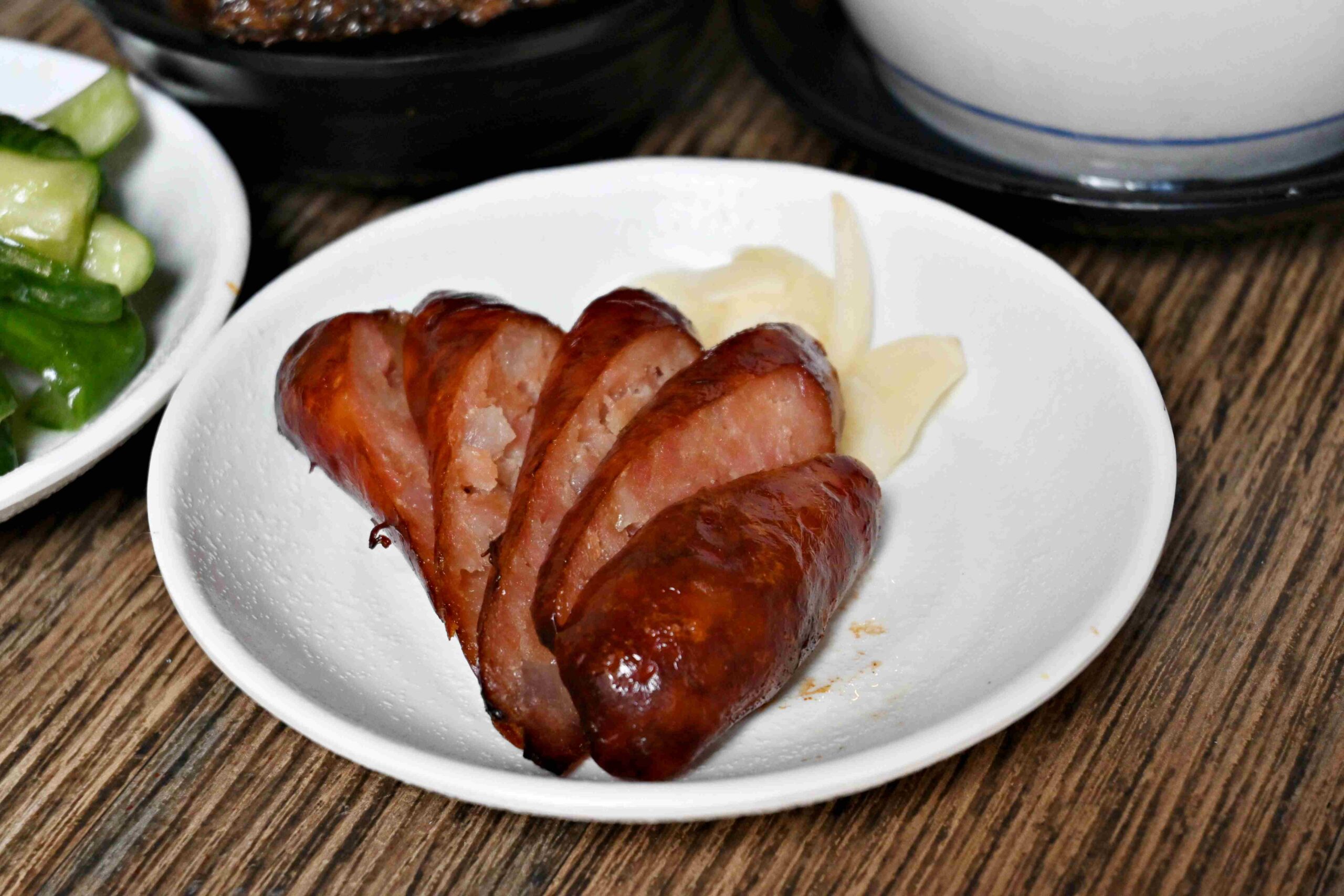 這道香腸看起來很簡單,但還真的滿香、滿夠味的,配著蒜片一起吃特別有爽度。香腸是偏肥瘦各半的那種,咬下去會有點Q、然後帶一點肉汁的感覺,不會乾乾柴柴,也不會油到膩口。