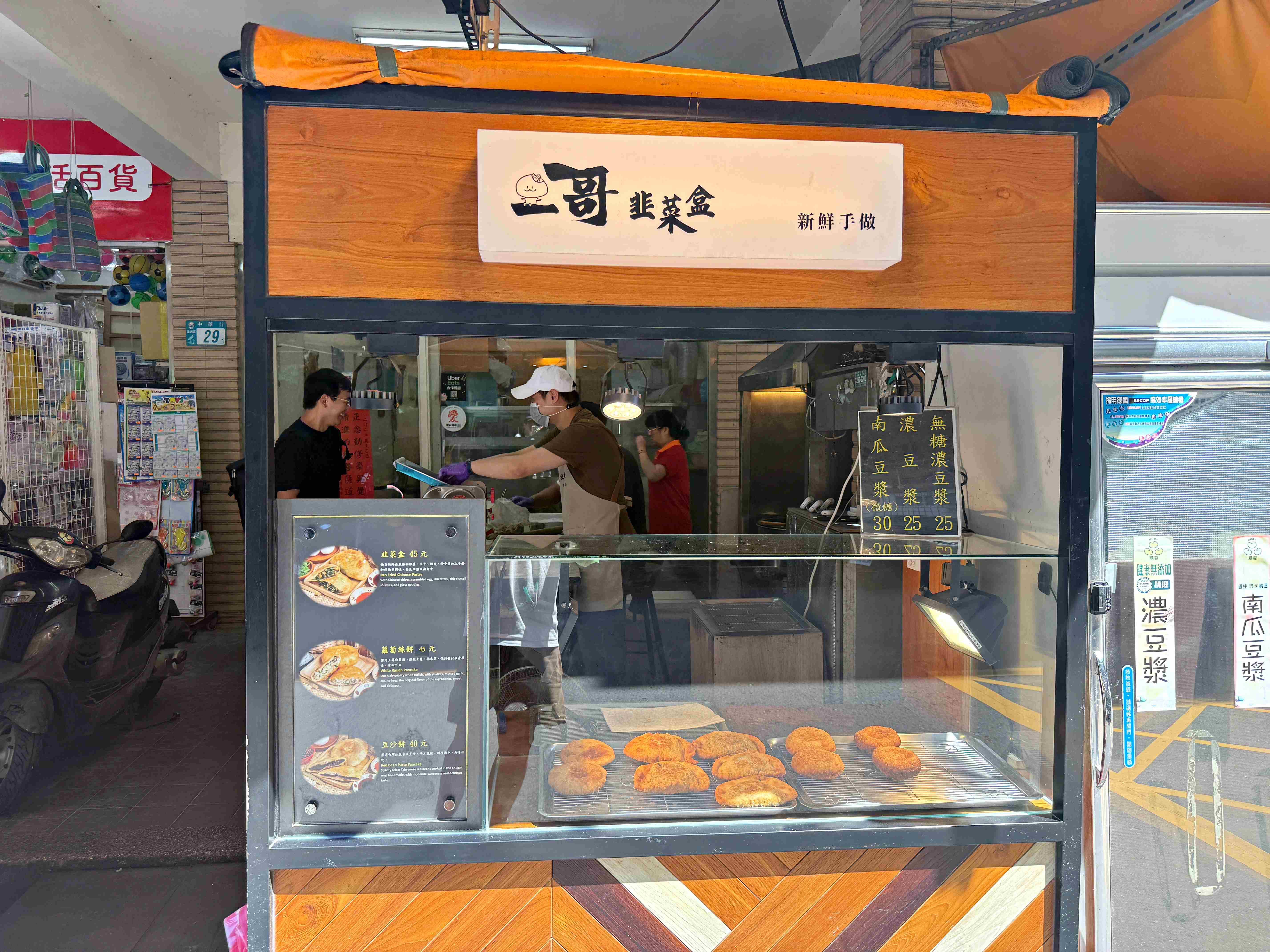 這間的品項很簡單,只有三種,但每樣都是現包現炸、賣完就收。最熱門的是韭菜盒,用韭菜、冬粉、豆干、雞蛋和蝦米組成,是最多人回購的定番選擇。蘿蔔絲餅則是用白蘿蔔絲加上蔥花、蒜末,喜歡清爽一點的可以選這個。想吃點甜的話也有豆沙餅,用的是台式紅豆餡,價格比另外兩款便宜一點。全部都是銅板價,常常還沒中午就賣光了。